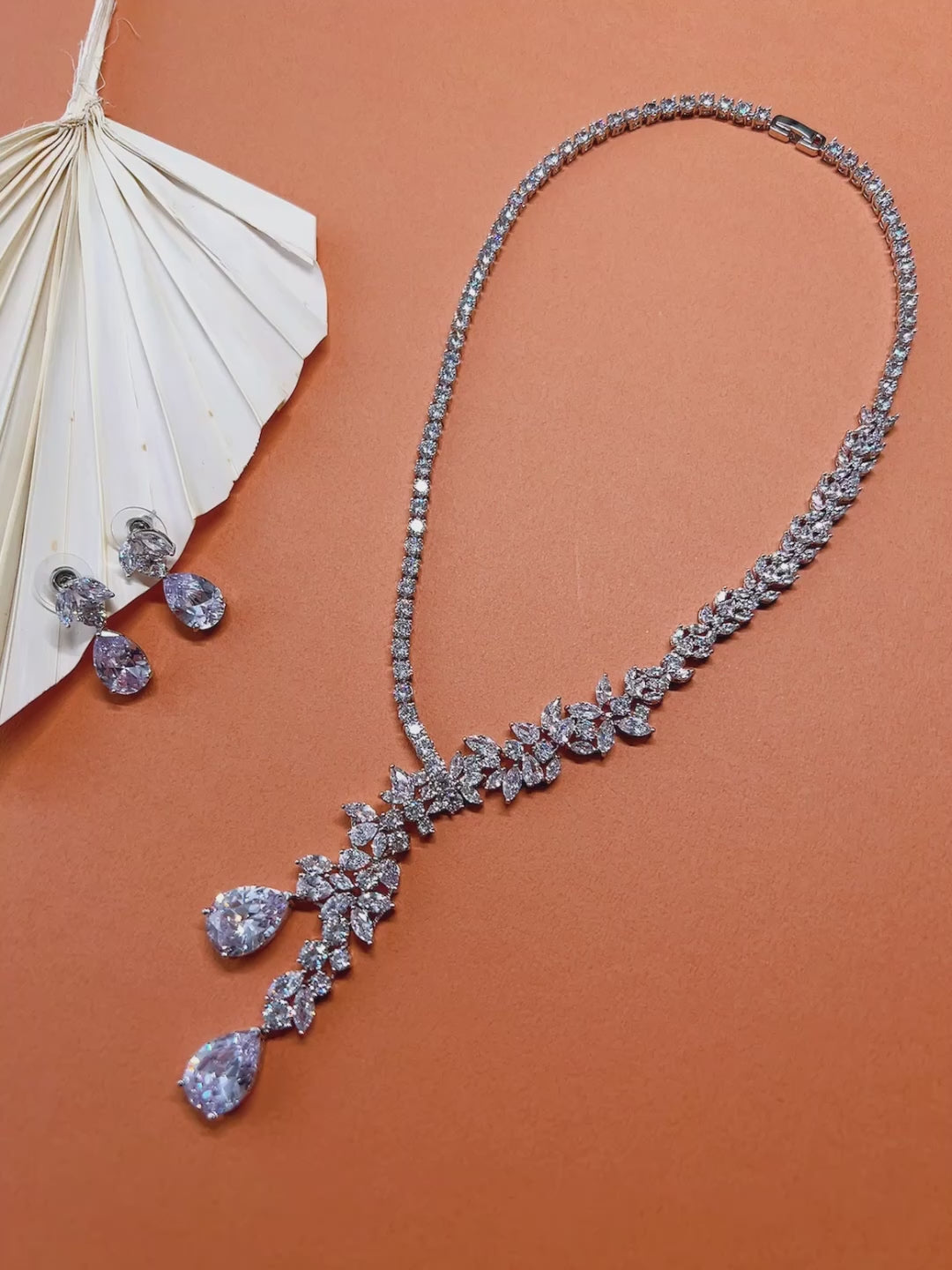 - The cascading cubic zirconia teardrop bridal jewelry set comprises a necklace and earrings.